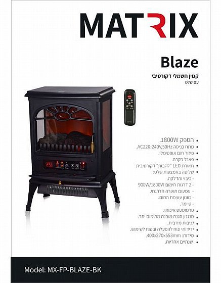 קמין חשמלי דקורטיבי דגם 1800W BLAZE MATRIX כולל שלט מידות: 553*270*400מ"מ שני מצבי חימום : חזק- 1800W חלש 900W