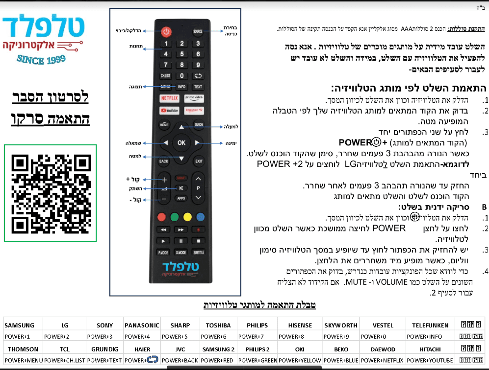 שלט תואם לרוב הטלויזיות הנמכרות בישראל .